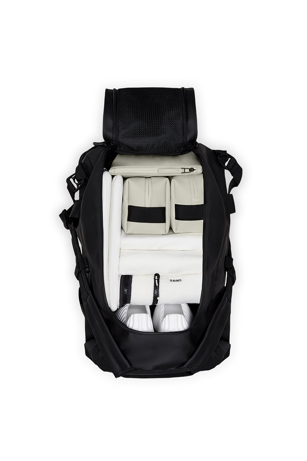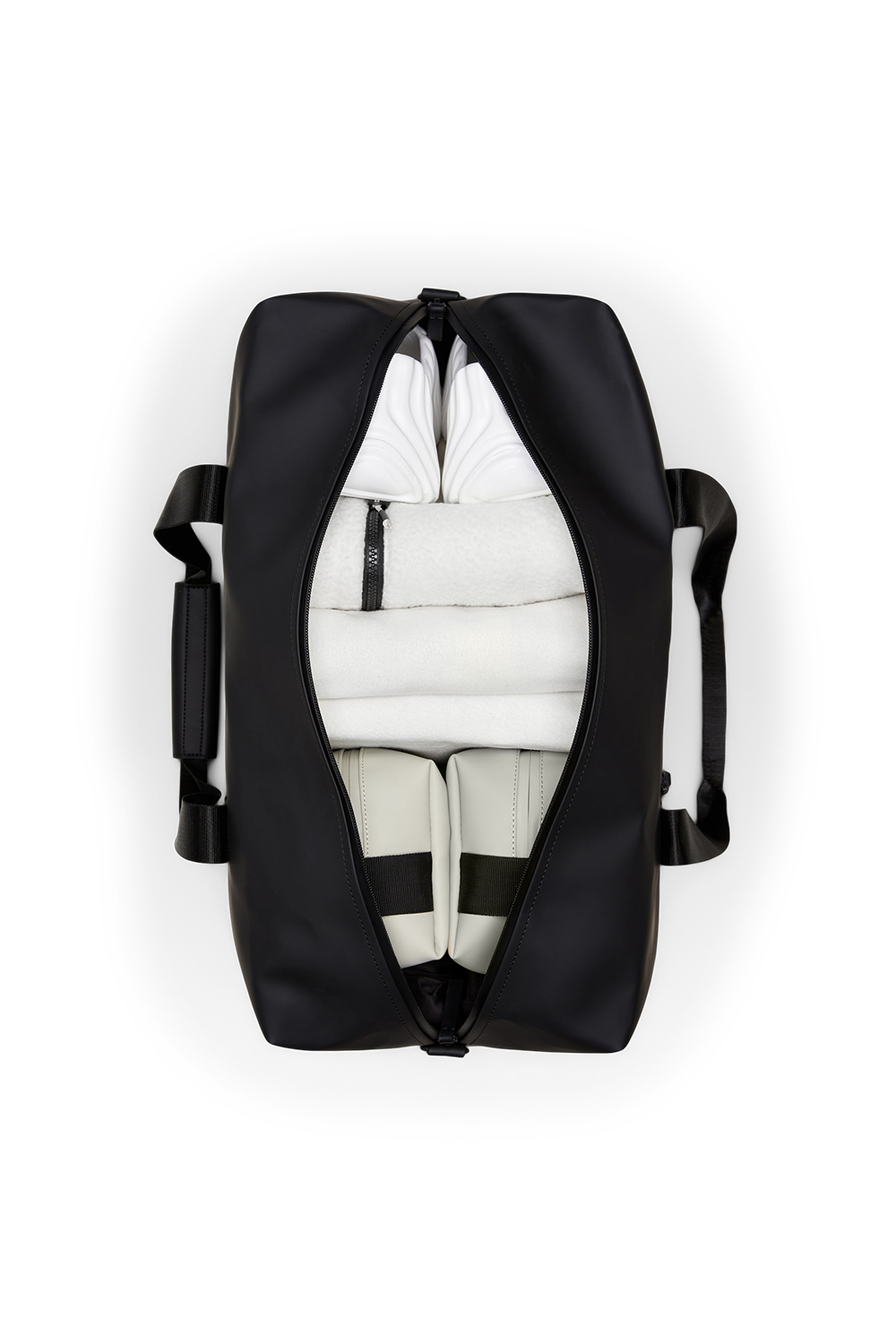 Texel Duffel Bag Small ist aus dem charakteristischen wasserdichten PU-Gewebe von Rains gefertigt, das sich durch Robustheit, Langlebigkeit und ein angenehmes Tragegefühl auszeichnet.