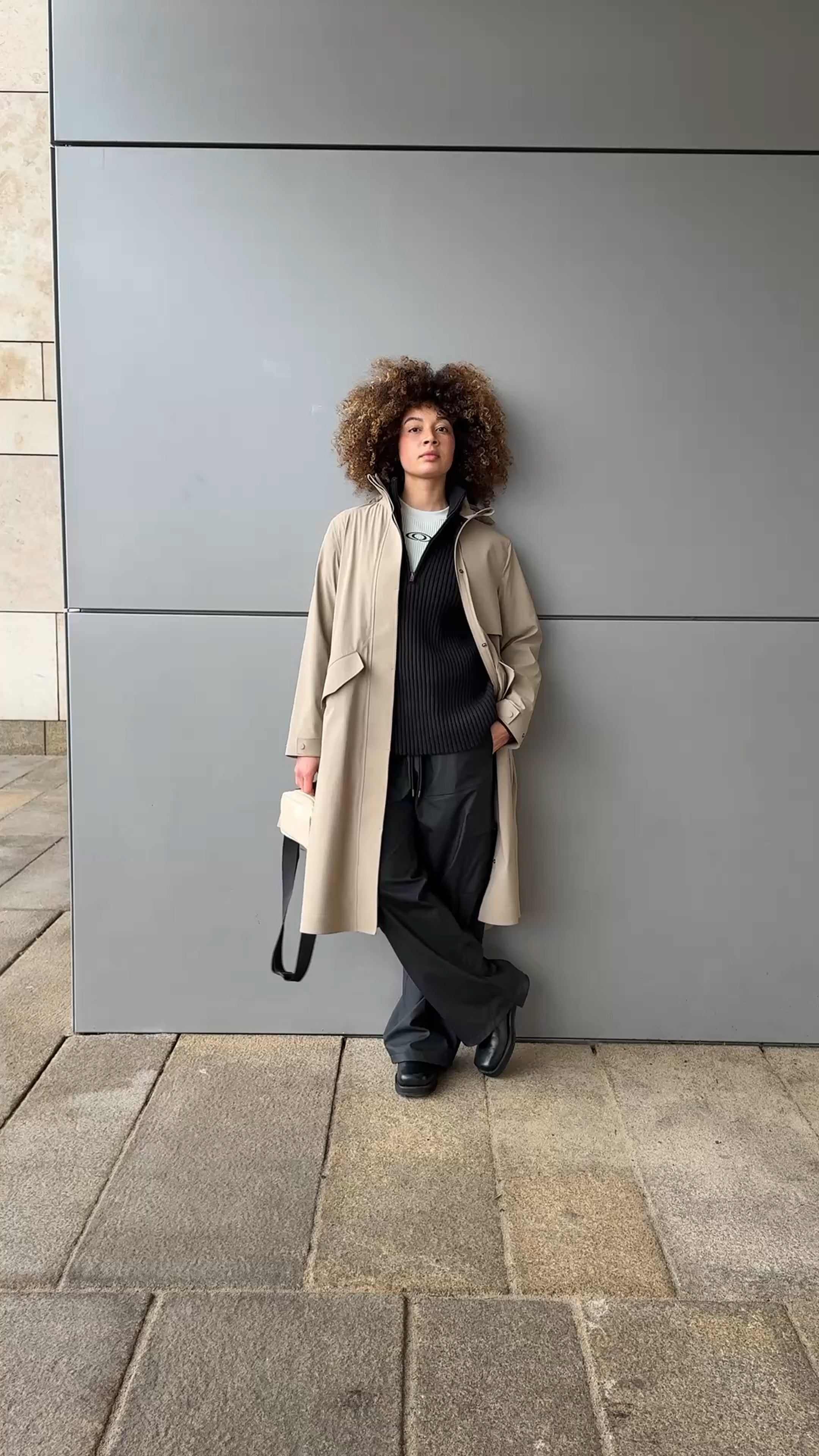 Der Mantel in A-Line-Passform verfügt über einen abnehmbaren Gürtel für eine tailliertere Silhouette und einen wasserdicht beschichteten Reißverschluss, der hinter einer Blende versteckt ist.