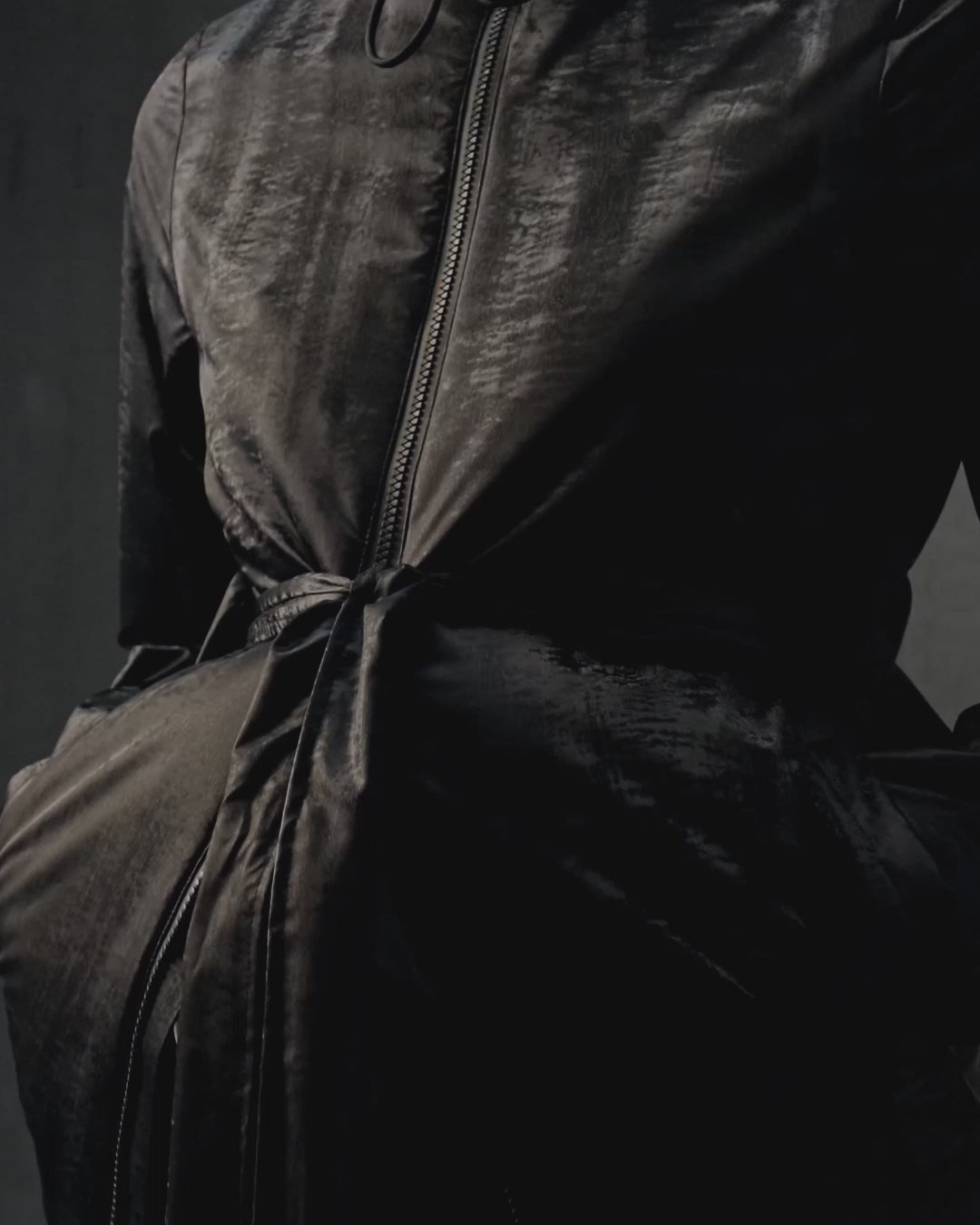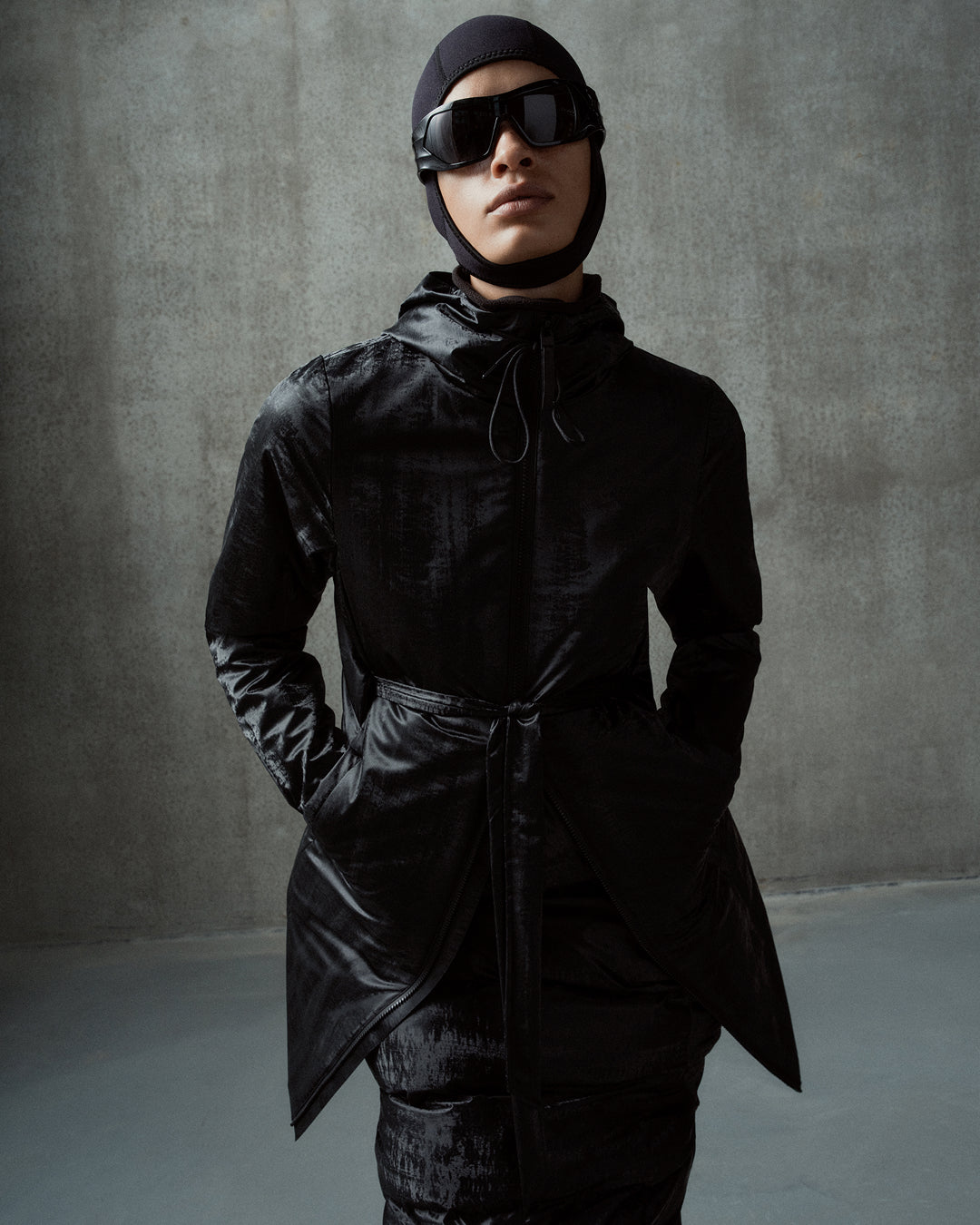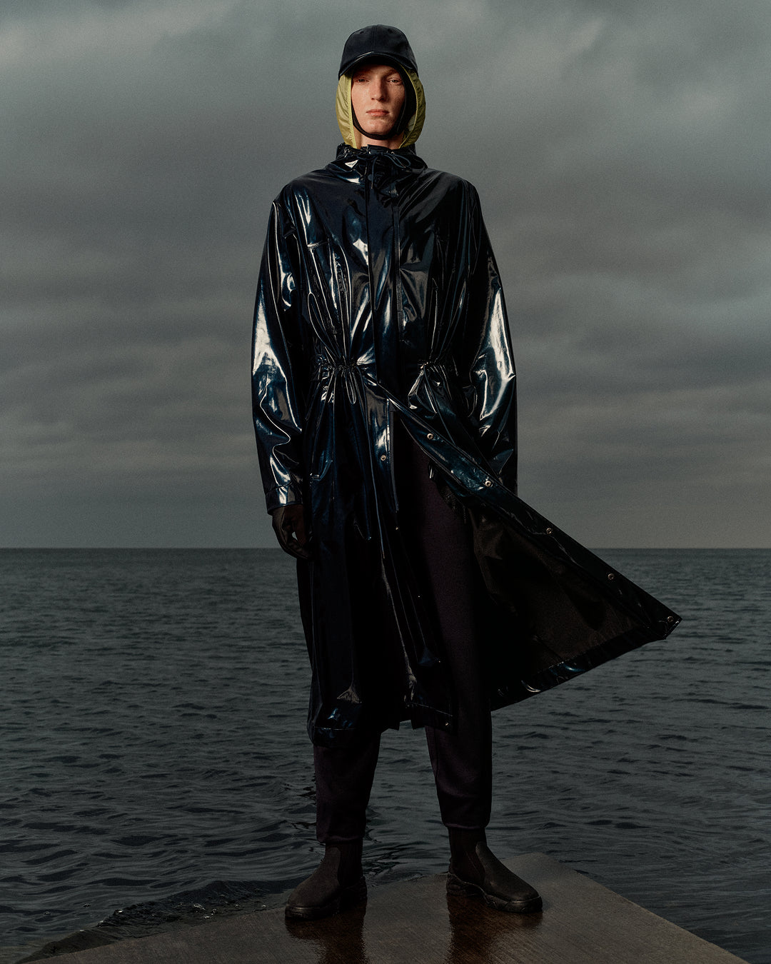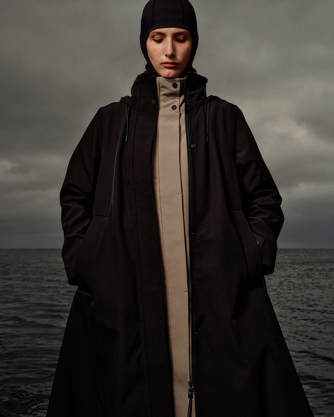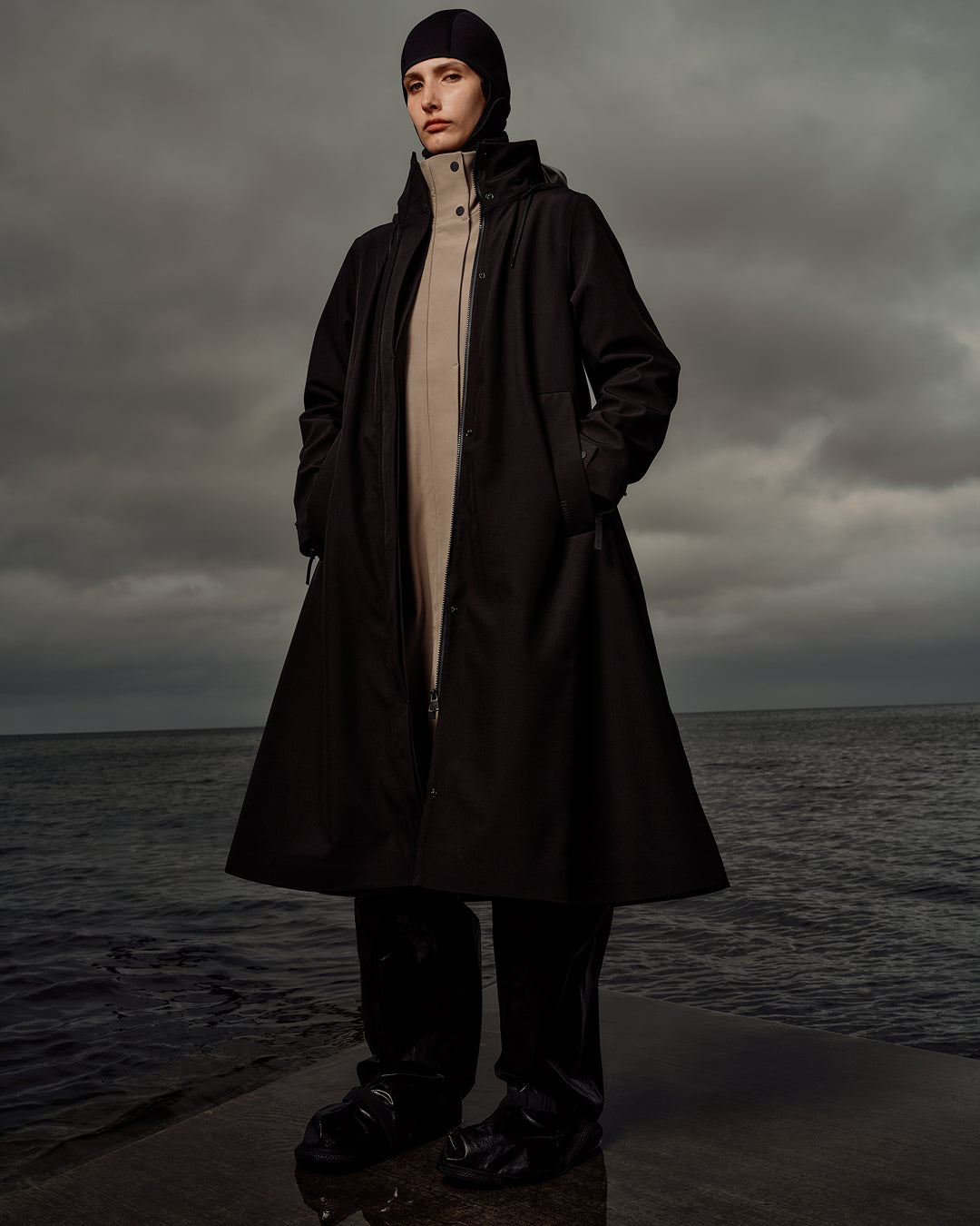 This design is characterized by its length and technical 3L fabric. The A-line shape becomes gradually exaggerated, adding dimension and utility to your seasonal looks.