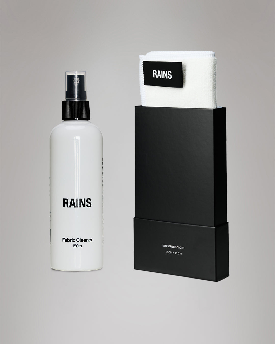 Bei sichtbaren Flecken: Rains Fabric Cleaner direkt auf die betroffene Stelle sprühen und anschließend mit dem Rains Microfiber Cloth sauberwischen.