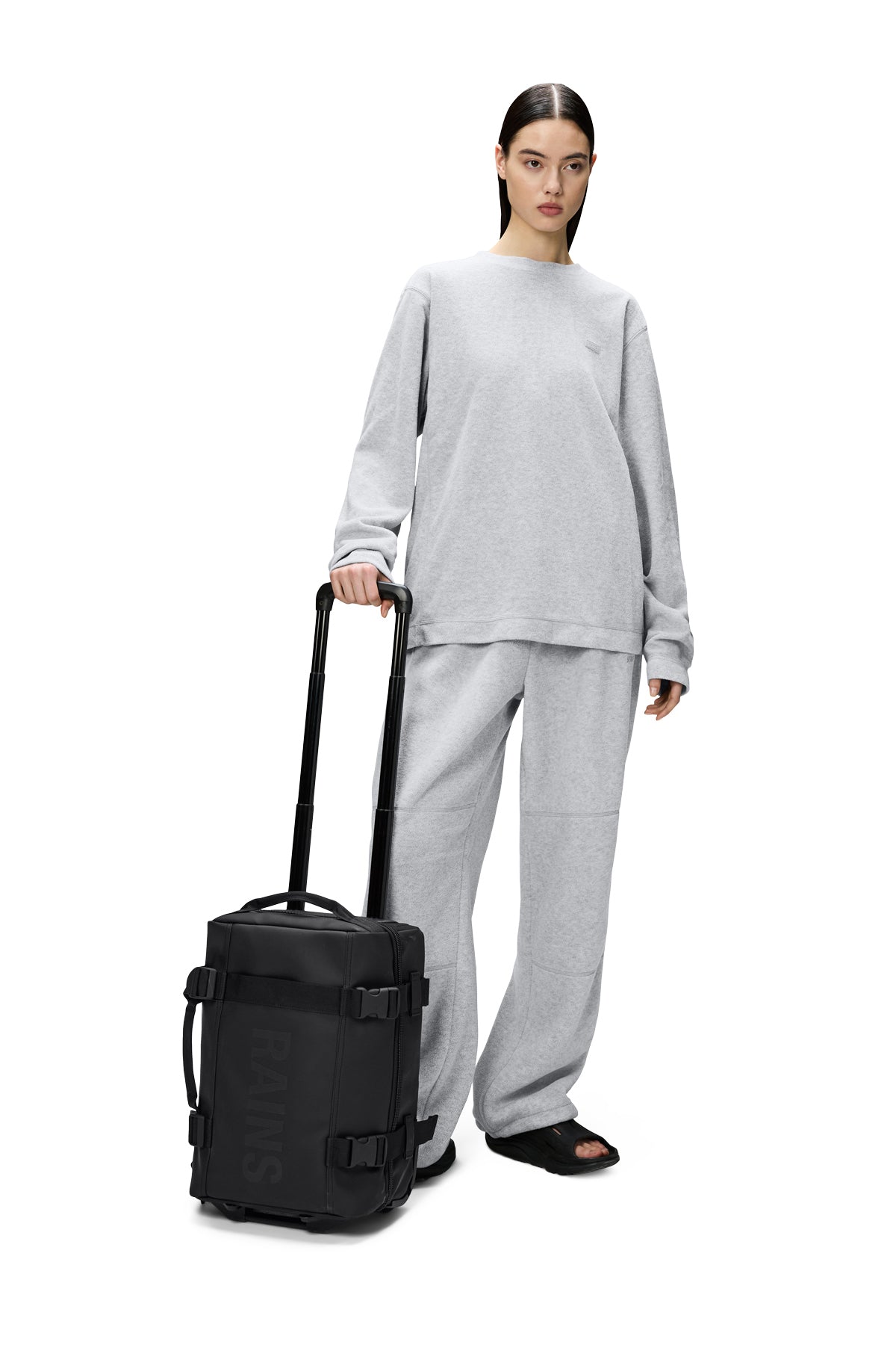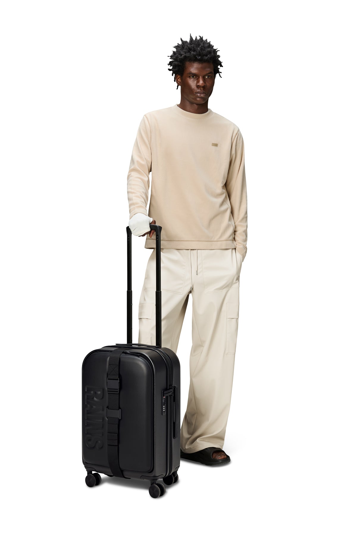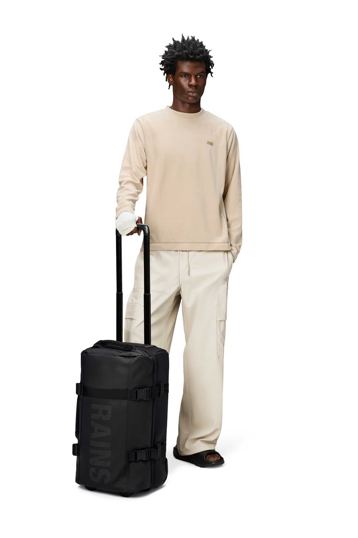 A travel-ready trolley bag in check-in dimensions. Cut from waterproof PU fabric.