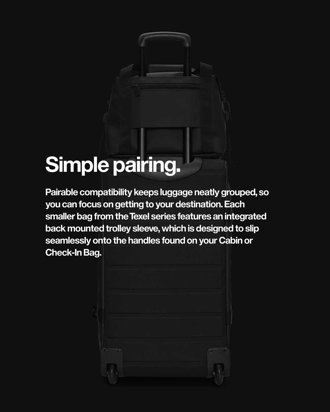 Last call for a seamless experience. Mixing functionality and design, our travel bags deliver smooth, lightweight transportation, waterproof protection for your essentials and unique pairing features – like slip-on trolley pockets – making it easy to be on the move.