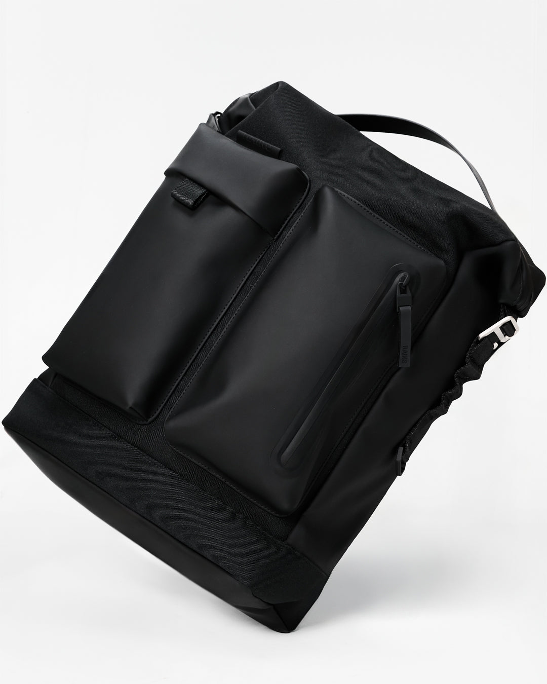 Doubles as a multifunctional tote with cargo finishes—waterproof and perfect for life in the city.