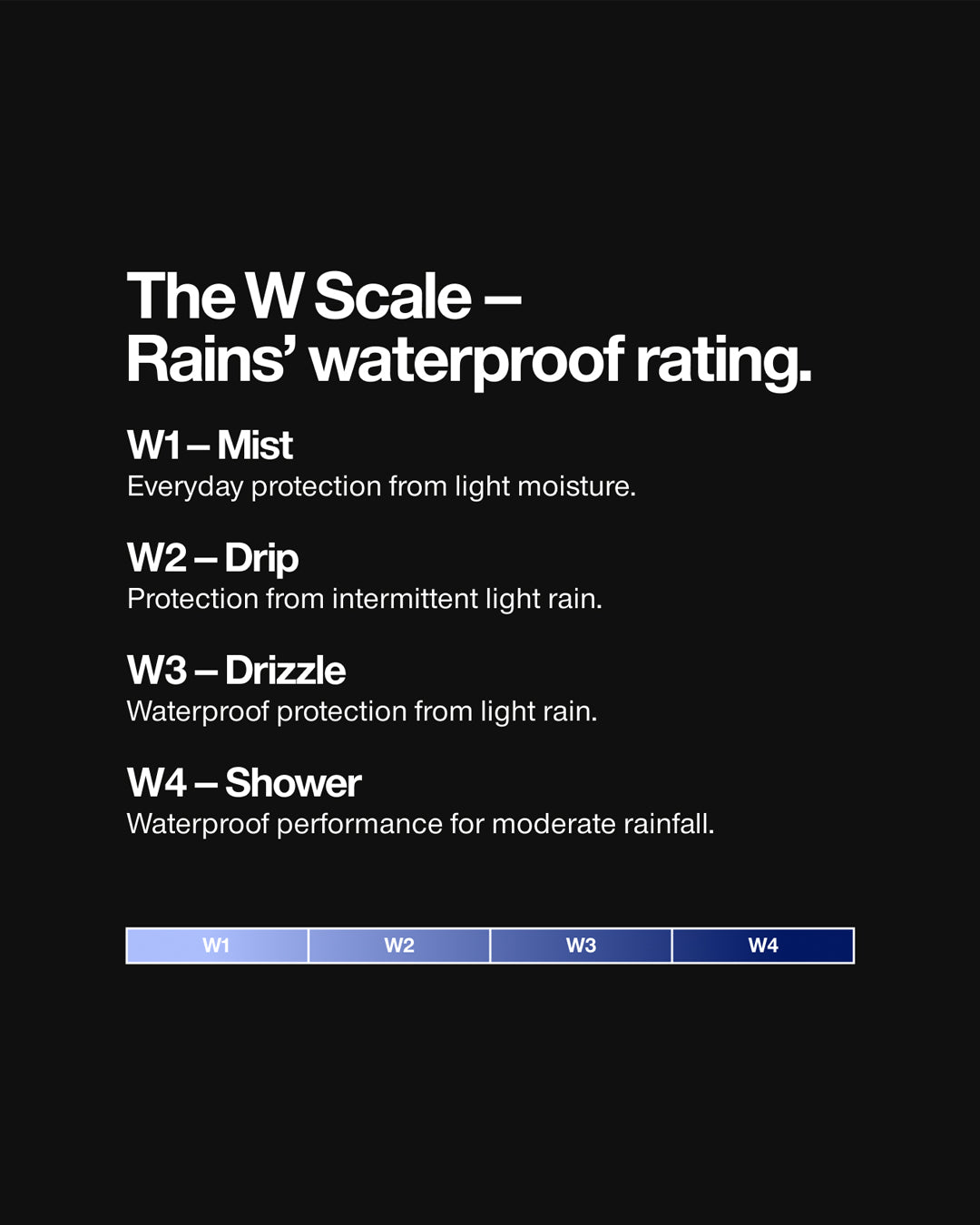 171 days. The average amount it rains in Denmark each year. Rains was crafted by this climate. Our waterproof styles designed to embrace it. Water runs through our story, our language, our products. Informed by one thundering truth: be ready and the rain won’t keep you inside.
